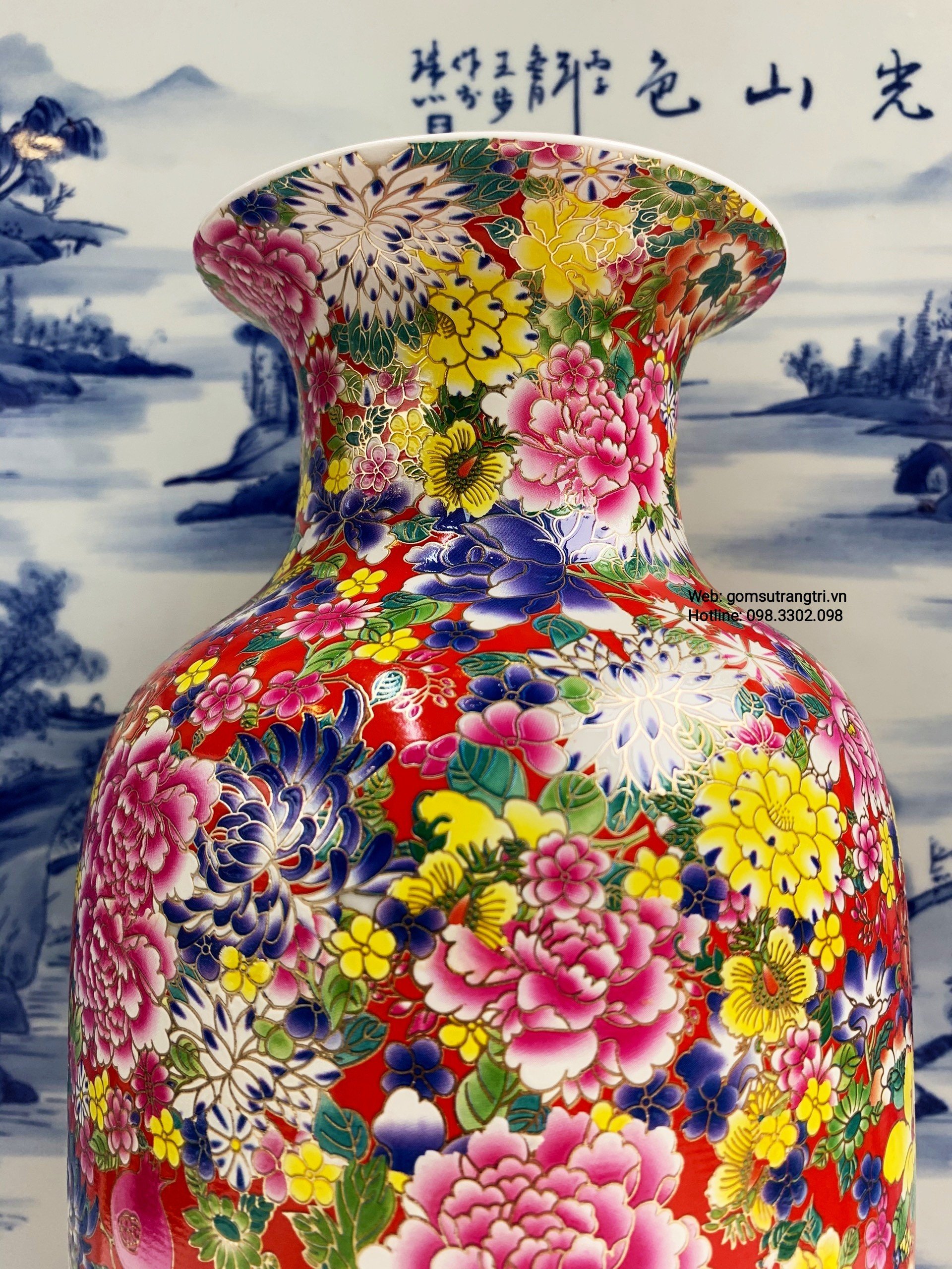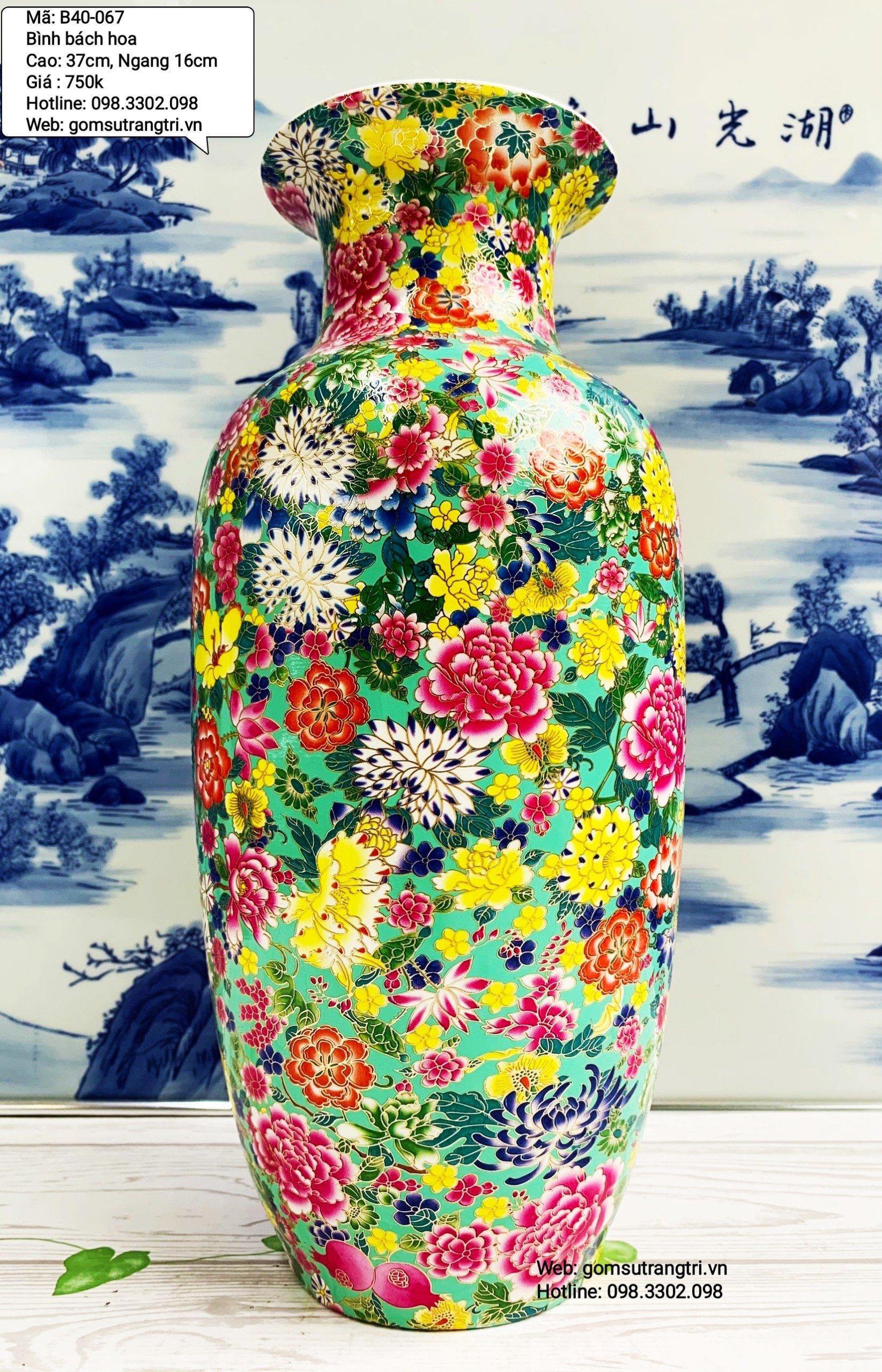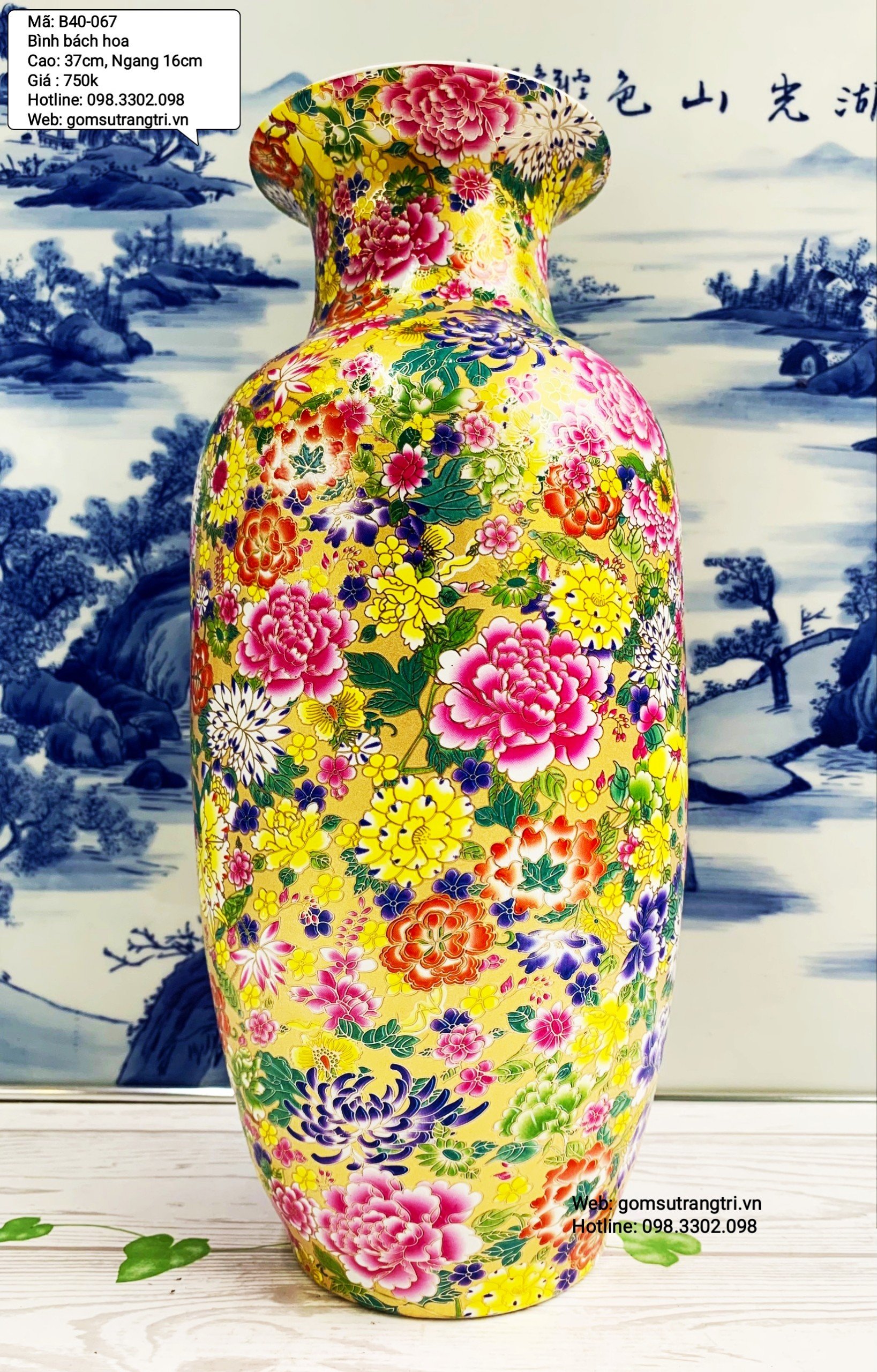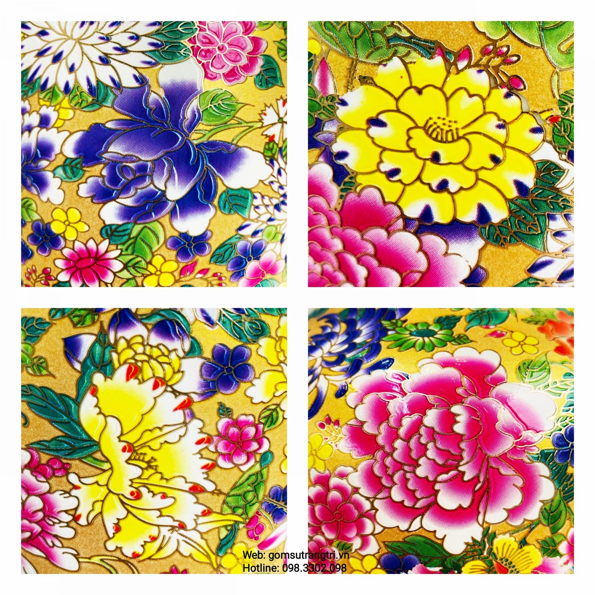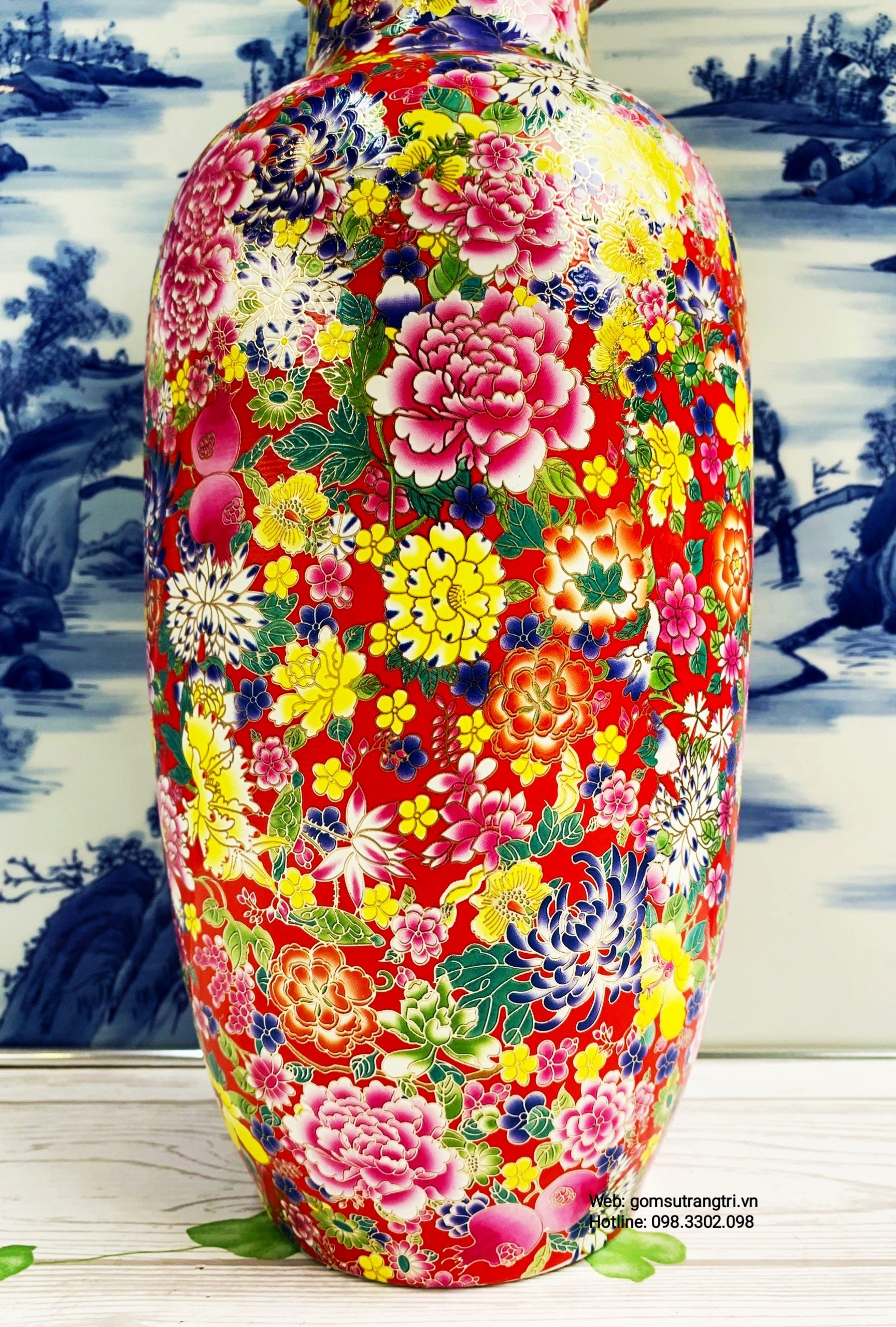 Dưới nền đỏ, người nghệ nhân đã khéo léo, tỉ mỉ tạo ra Bình Bách Hoa với rất nhiều màu sắc của các loài hoa đang đua nhau khoe sắc hương vô cùng đẹp mắt, tính xảo và mang nhiều ý nghĩa.