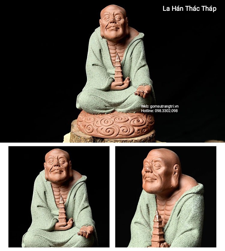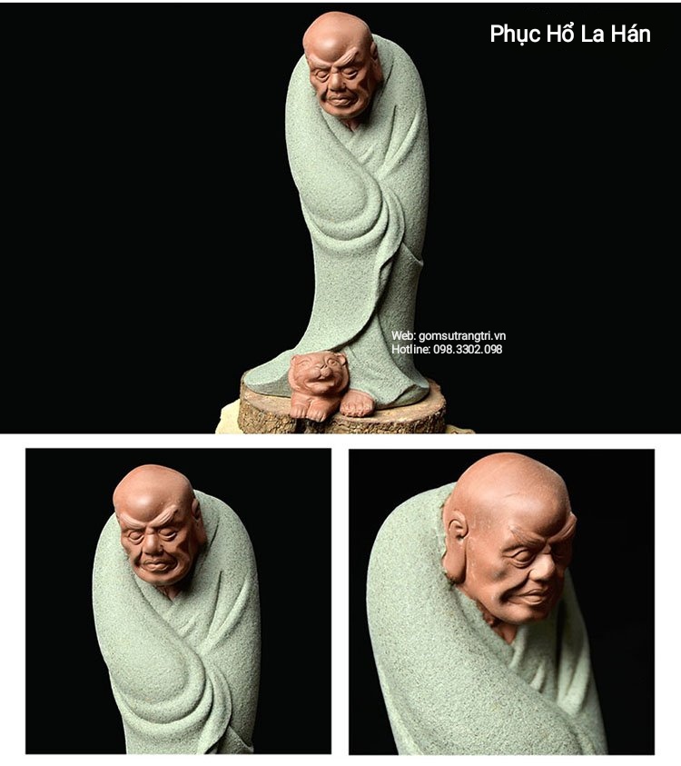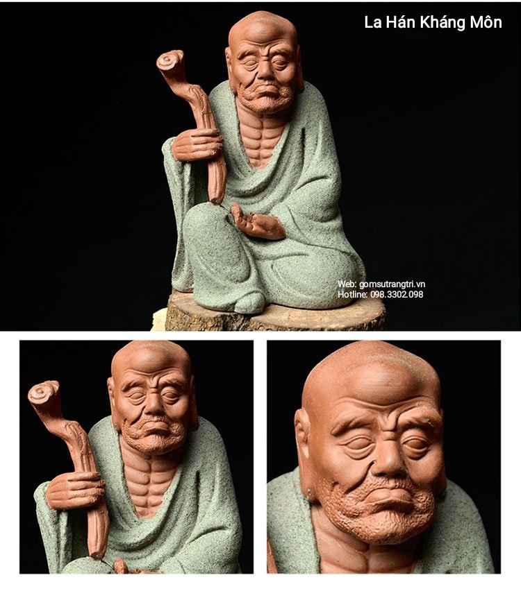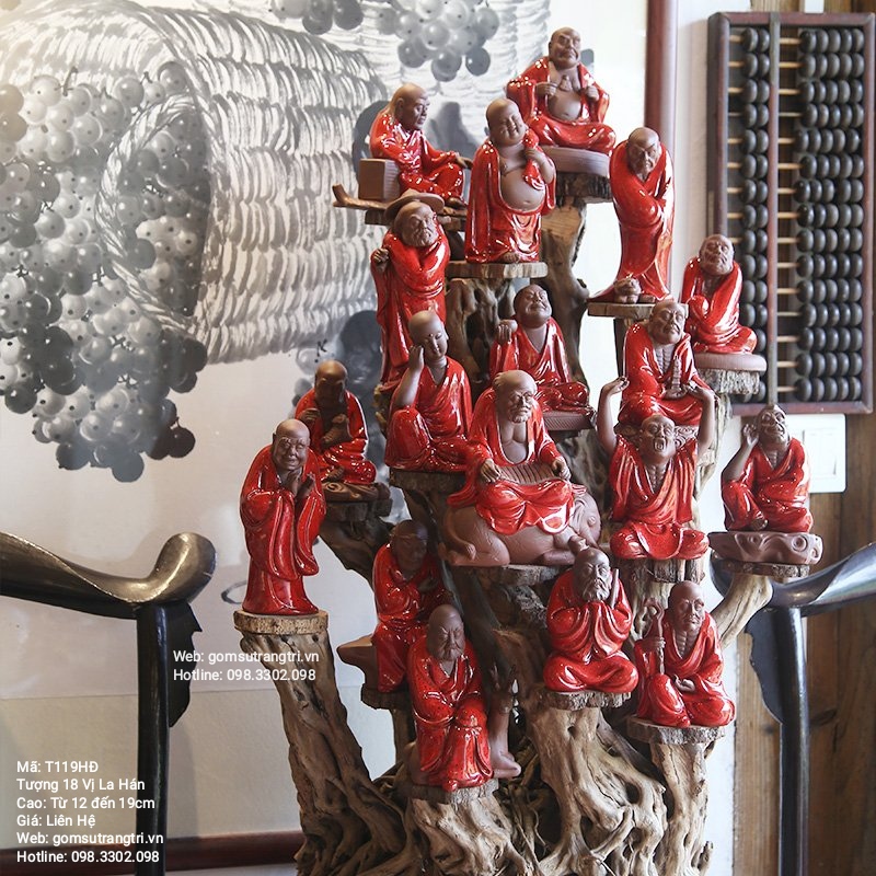 Tượng 18 vị La Hán được chế tác hoàn toàn thủ công bằng đôi bàn tay người nghệ nhân. Từ chất liệu sứ cao cấp qua đôi bàn tay nhào nặn khéo léo đã tạo nên ngoại hình các bức tượng với ngũ quan rõ ràng, sắc sảo toát lên cái hồn thần thái rất riêng trên từng sản phẩm. Kết hợp với màu men nâu, đỏ, xanh vô cùng nhã nhặn và tươi sáng.