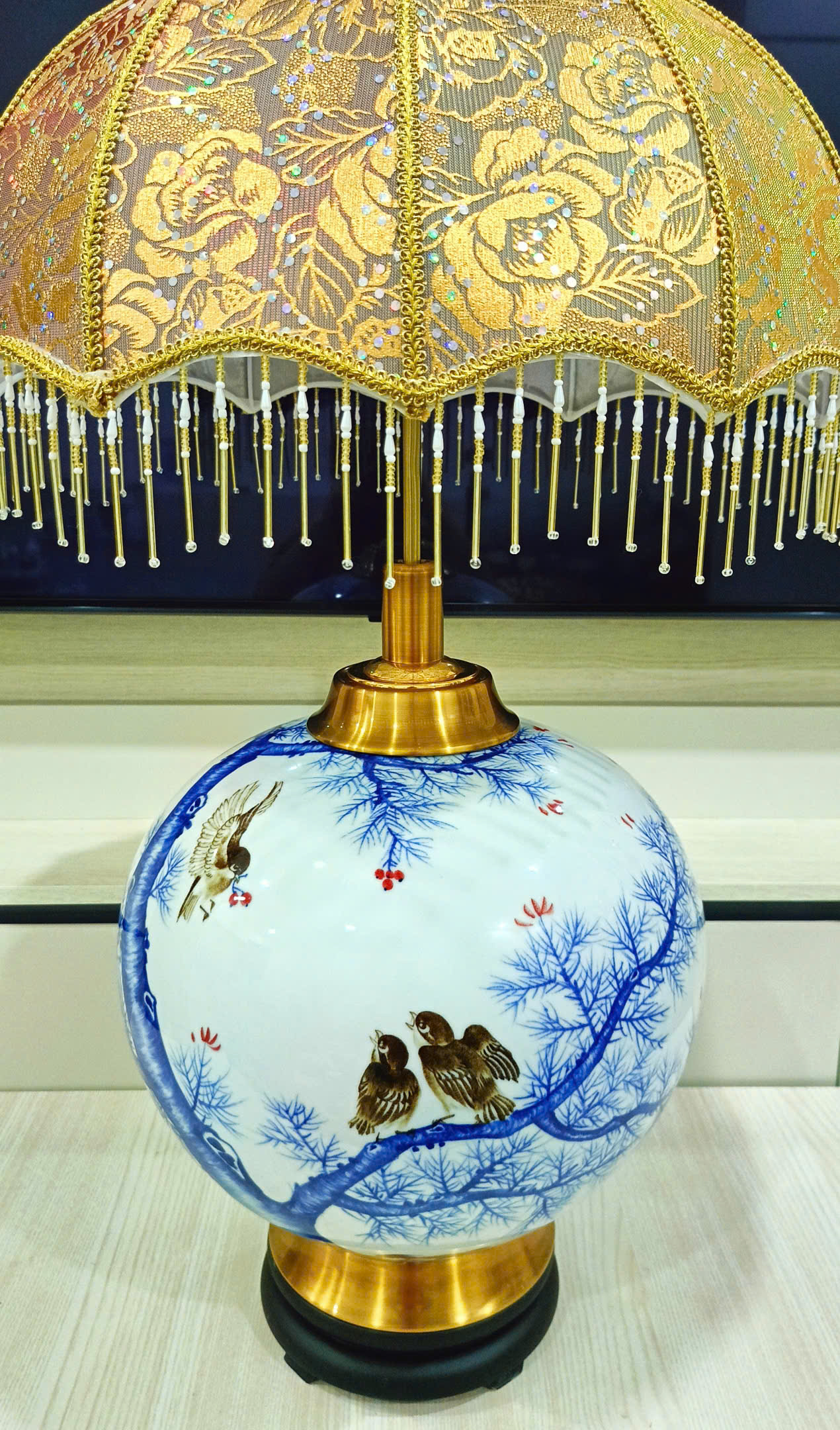 Không chỉ là một chiếc đèn chiếu sáng, đây còn là tác phẩm nghệ thuật mang đậm giá trị thẩm mỹ và phong thủy. Cặp đèn bàn thiết kế họa tiết chim hoa phú quý được chế tác tinh xảo, từng đường nét mềm mại, sống động như một bức tranh thiên nhiên thu nhỏ – biểu tượng cho tài lộc, phú quý và cuộc sống viên mãn.