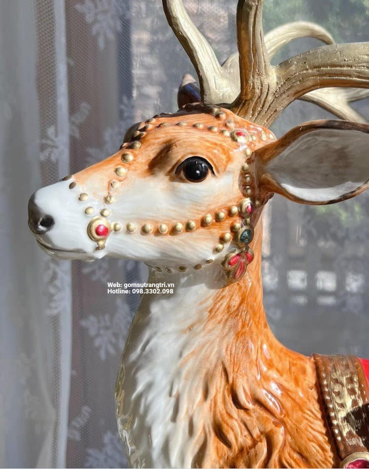 Tượng Hươu làm từ sứ cao cấp. Sản phẩm được gia công tỉ mỉ, từng chi tiết trên chú hươu được tả thực mang đến cảm giác chân thật uyển chuyển sống động. Chất liệu được chọn lọc kĩ càng, màu men bóng, bền theo thời gian.