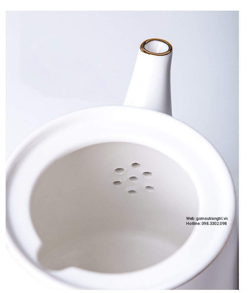 Phần nắp ấm được thiết kế khóa 2 bên để tránh rơi. Đặc biệt nắp viền vàng vẽ tay được thiết kế với màu sắc tươi sáng, trang nhã và không phai. Bên trong ấm còn có những lỗ nhỏ giúp pha trà thuận tiện hơn.