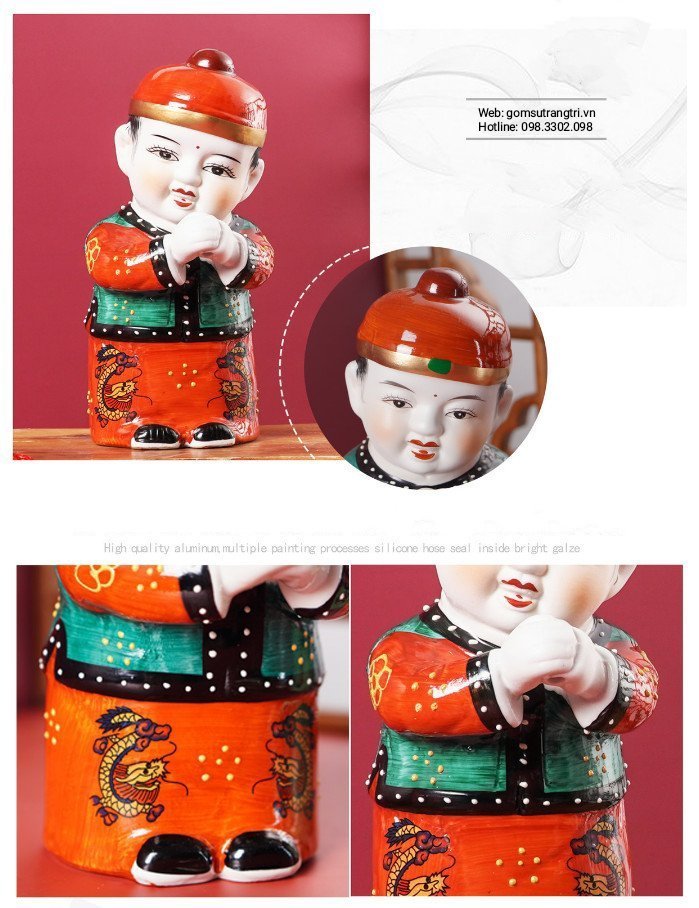 - Trưng bày cặp tượng tiểu đồng chúc phúc để cầu may mắn và phúc - thọ song toàn. đặc trưng lúc ngắm nhìn nụ cười hiền hòa, ngây thơ, trong sáng của hai đồng tử sẽ với lại cảm giác thư thái, sáng khoái trong tâm hồn, từ ấy giữ cho tâm hồn được thanh tịnh, an nhiên để cuộc sống được thuận hòa, bớt găng, mệt mỏi, khi tâm hồn được vui tươi thì chúng ta sẽ cảm thấy lạc quan và yêu đời hơn.